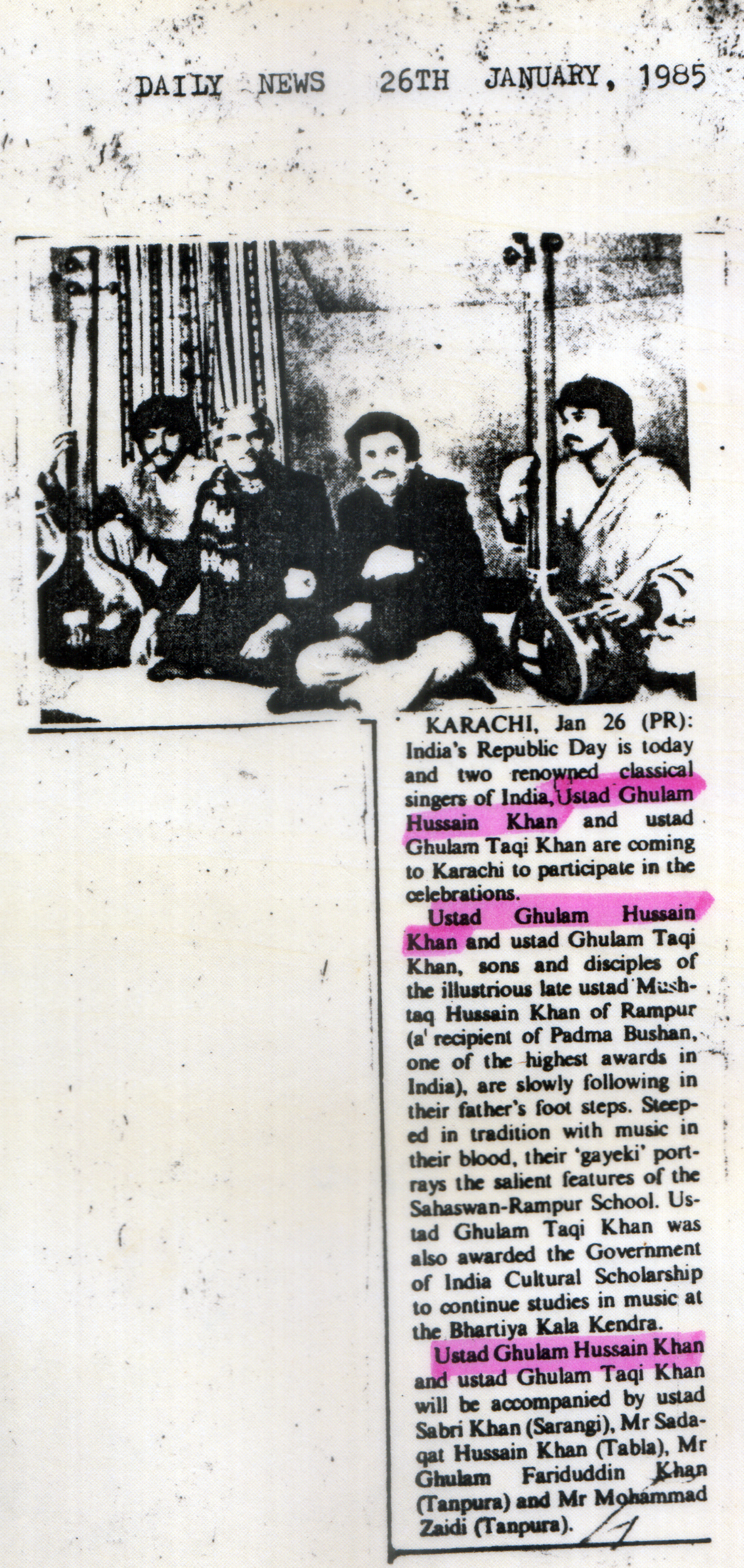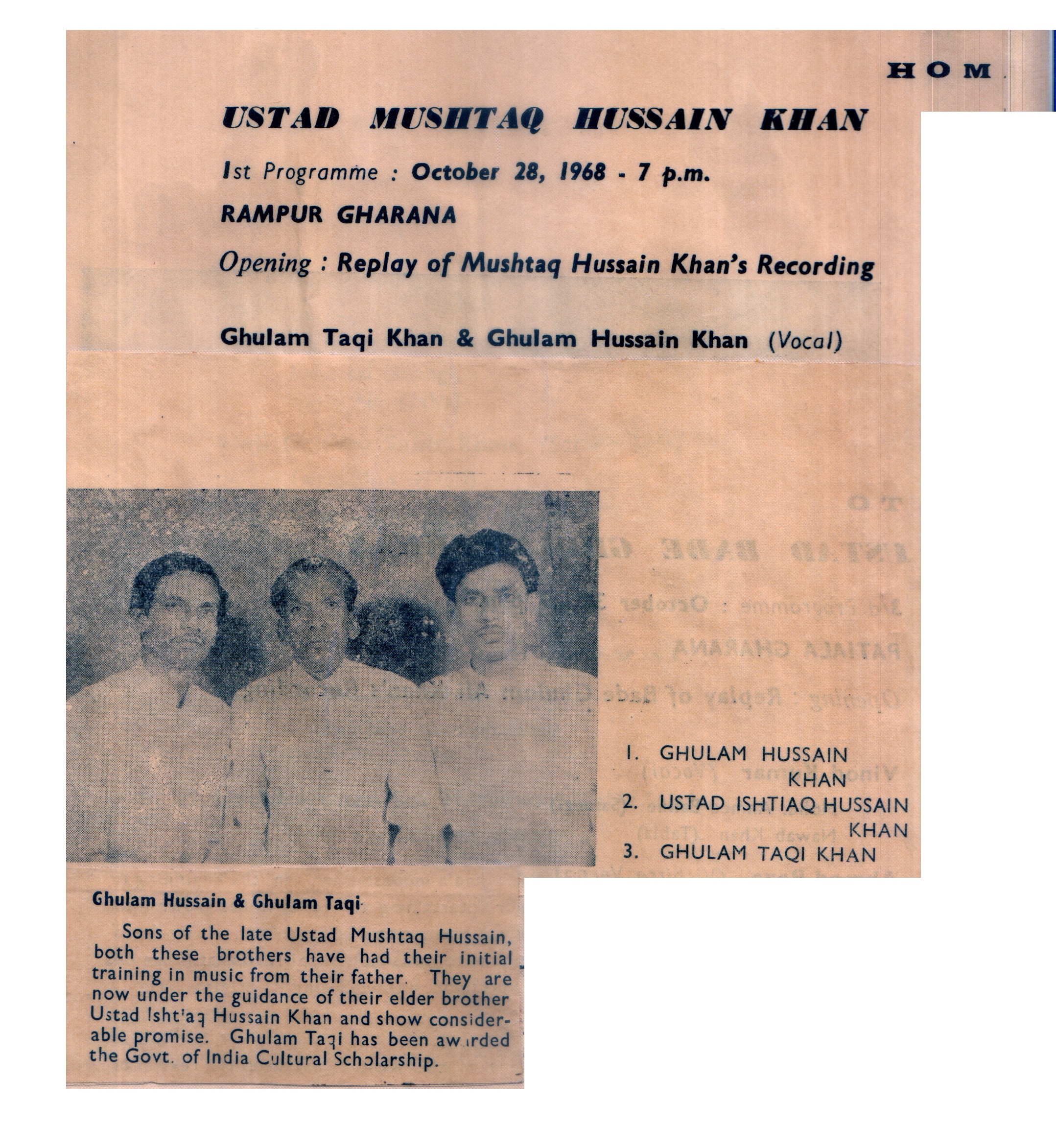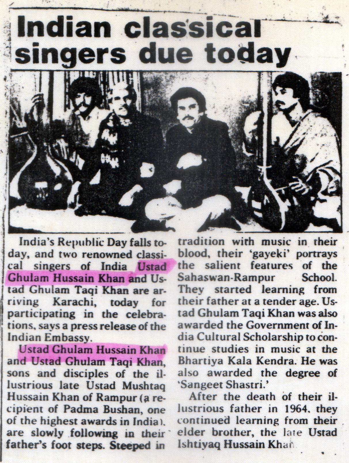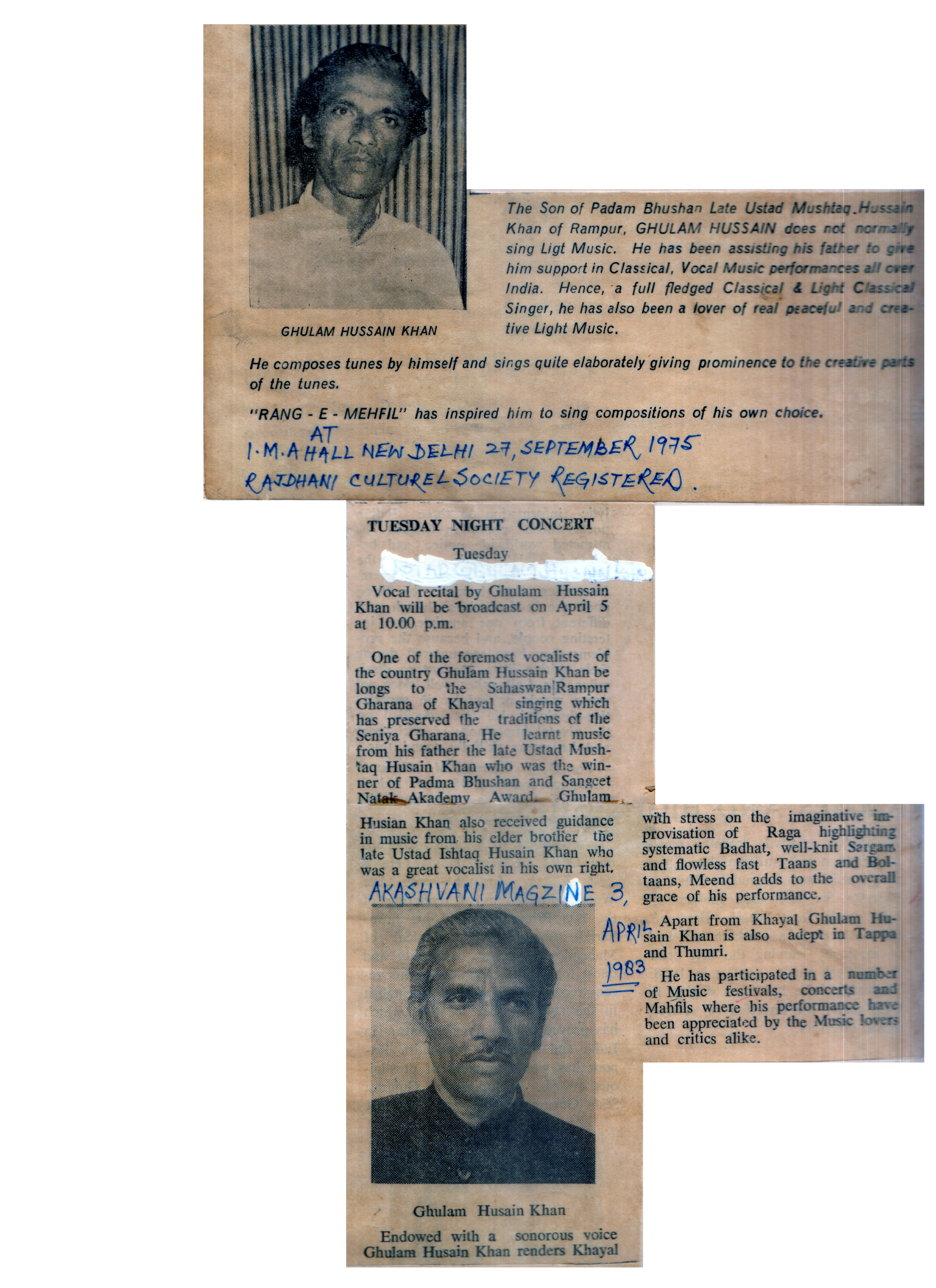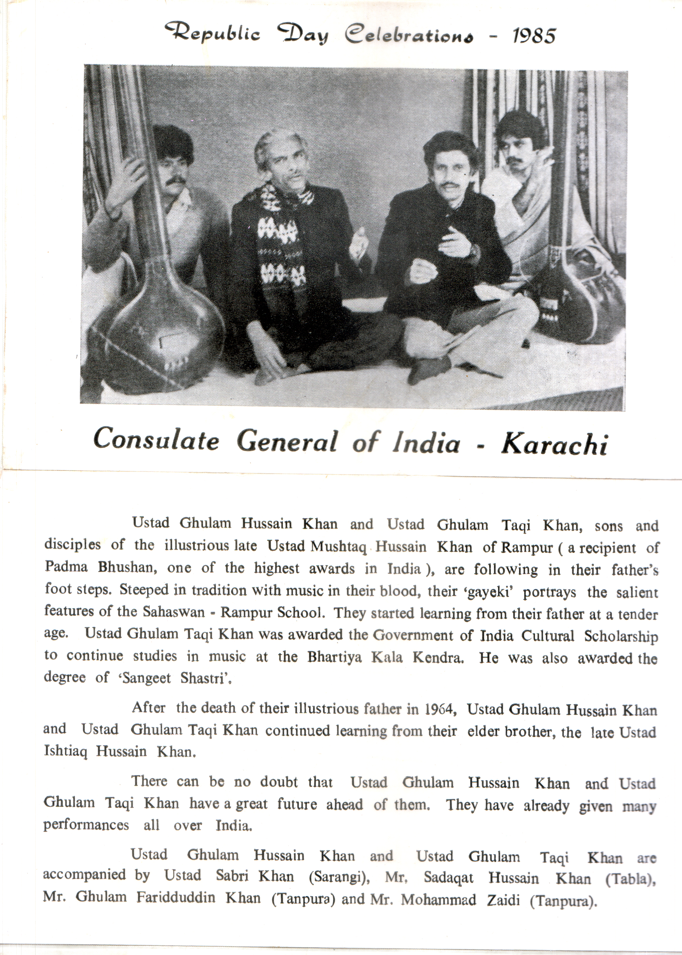 Press Releases of Late Ustad Ghulam Husain Khan